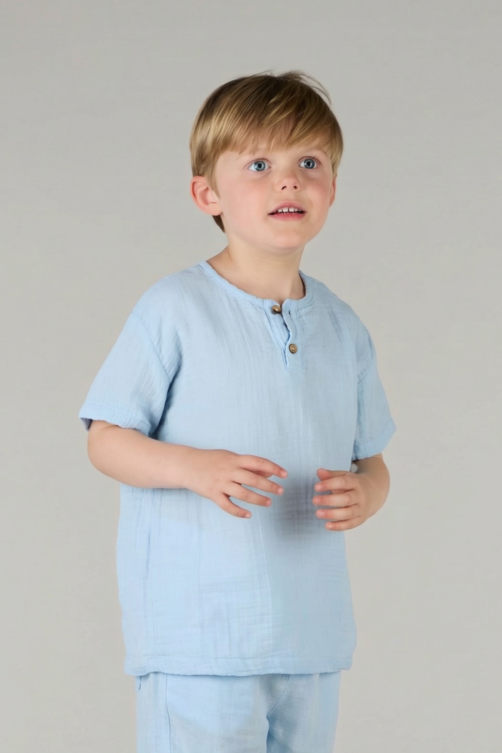 حافظي على شعور طفلك بالانتعاش والأناقة في يوم صيفي مع التي شيرت الأبيض الناعم ذو الياقة المستديرة للأولاد. مصنوع من 100٪ قطن ناعم ، هذا التيشيرت سوف يشعر بالراحة والضوء طوال اليوم. يتميز بتصميم برباط وأربطة من الأمام ، هذا التيشيرت كلاسيكي عصري لقضاء أيام ممتعة في الشمس.