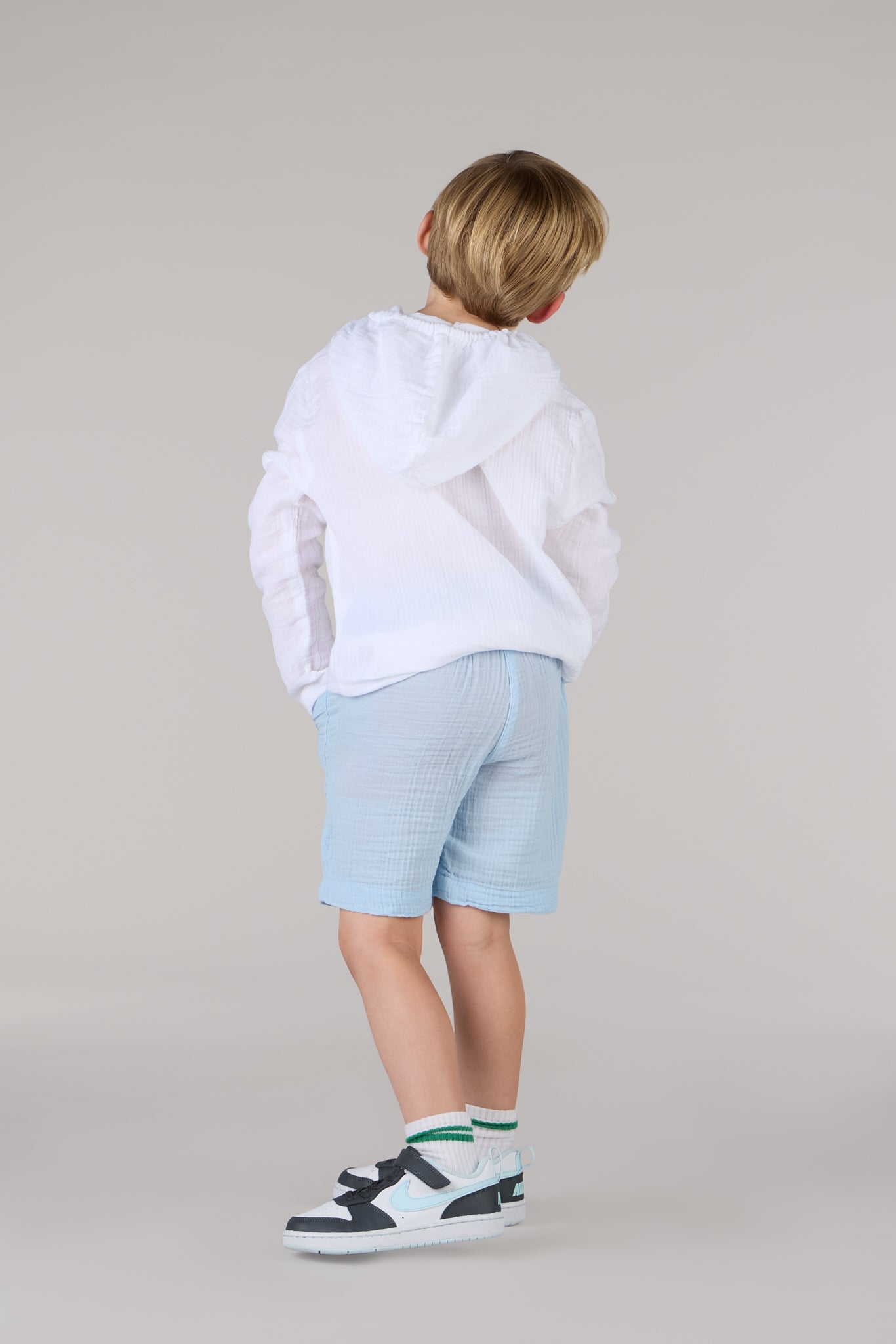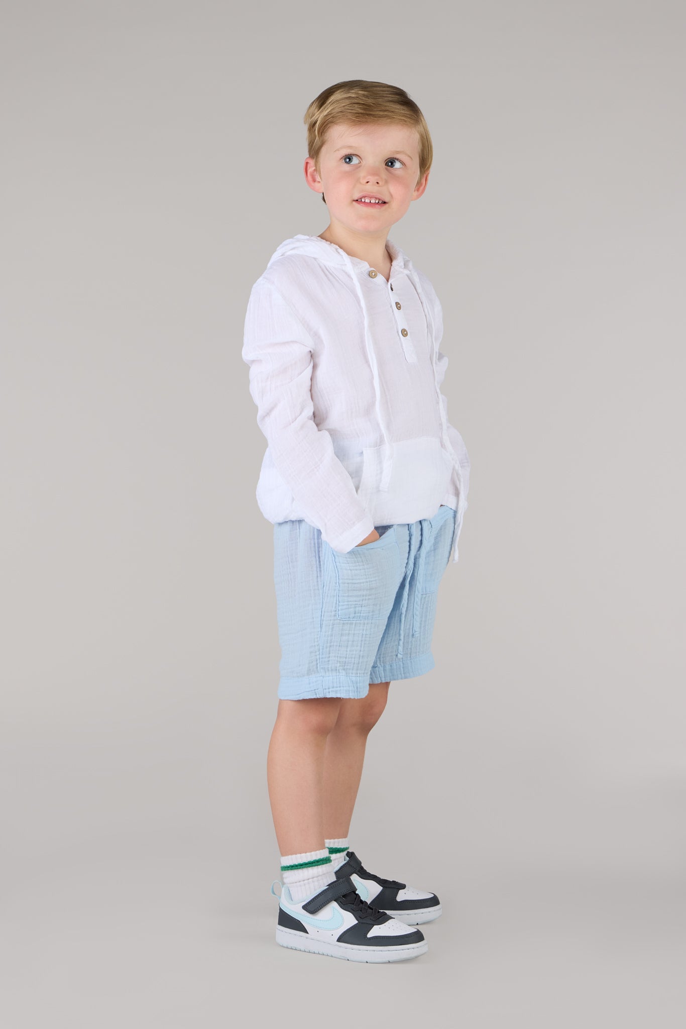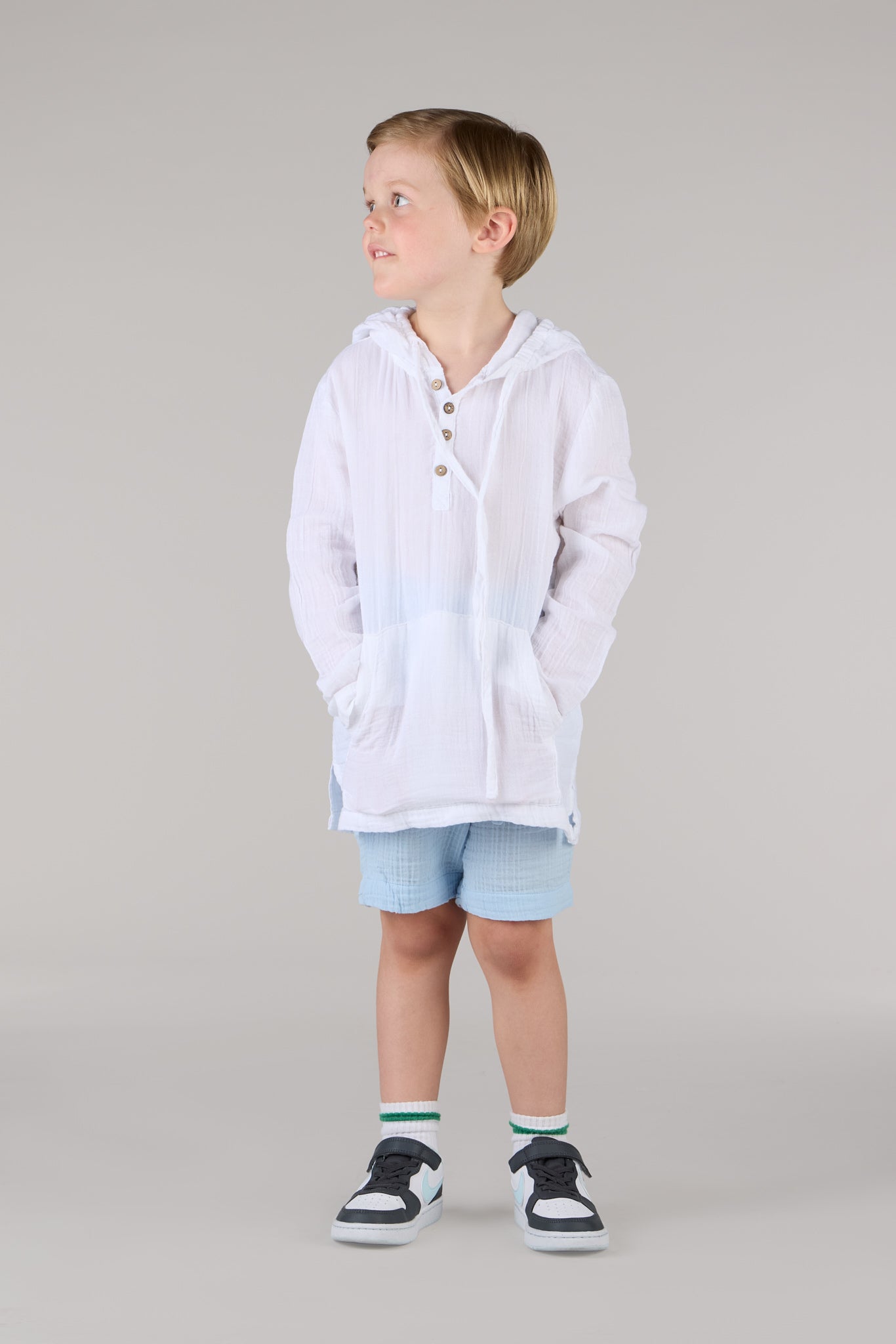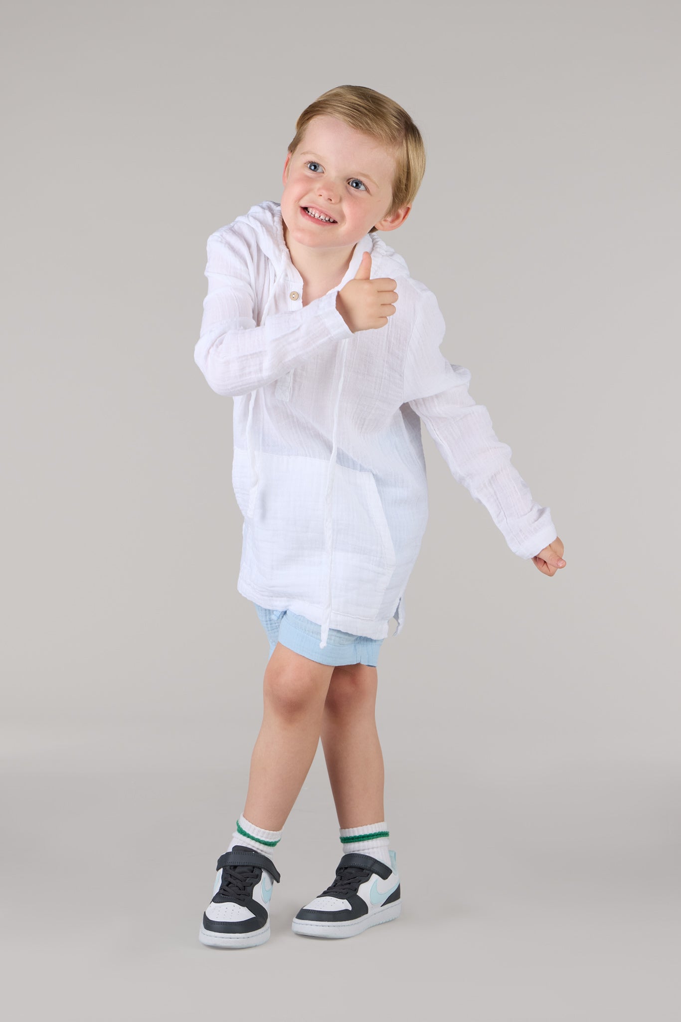 Keep your child cozy and stylish with this versatile beige hoodie shirt. Made from 100 % soft cotton, it features a comfortable fit with a lightweight texture, making it perfect for year-round wear. Designed with a hood, buttoned front plucked, and a functional front pocket, this hoodie blends casual charm with practicality. A great choice for layering or standalone wear, it's a wardrobe staple for every young adventurer.