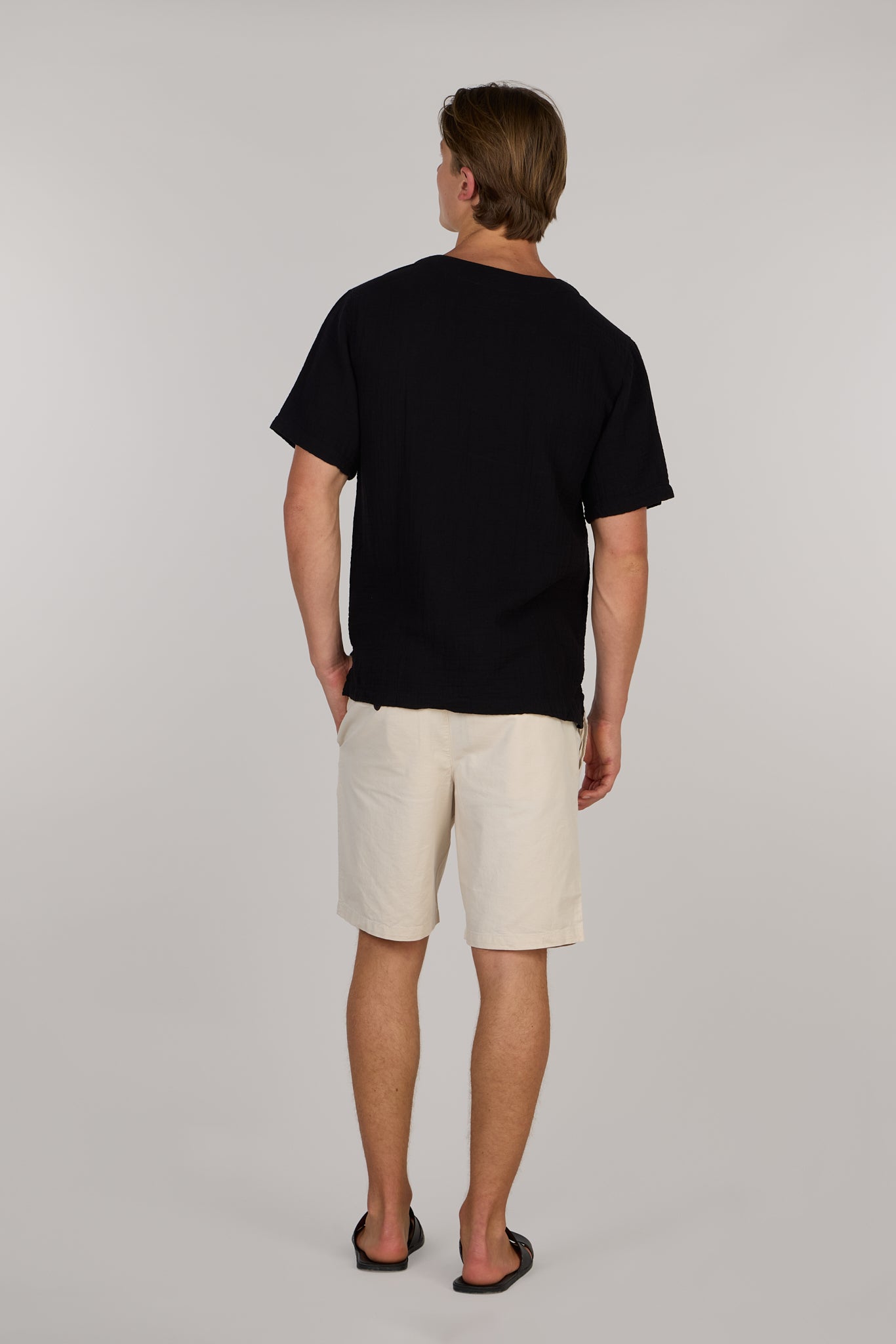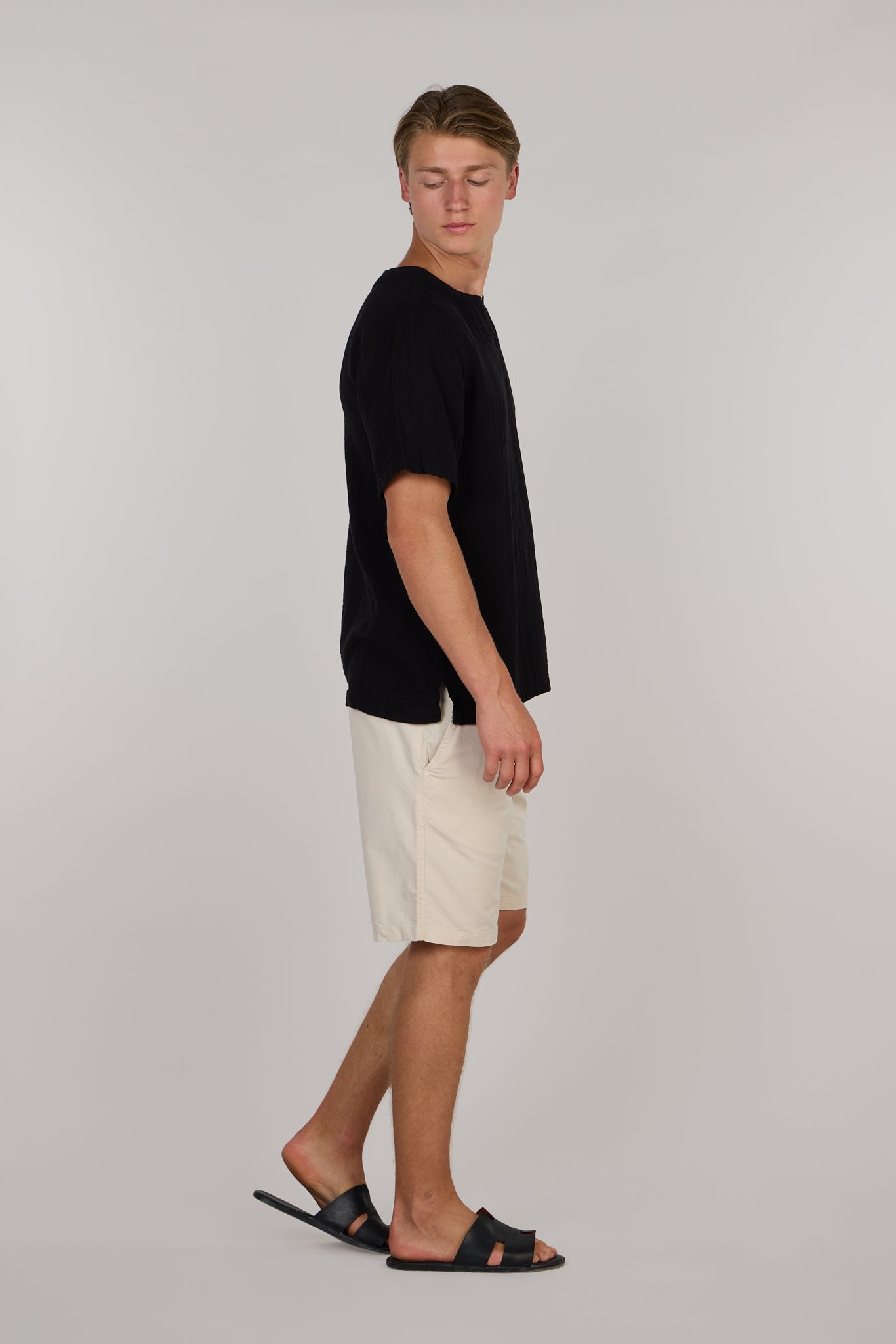 Find comfort and style in our crew neck cotton white shirt for men. This short-sleeve shirt comes in a distinctly care-free, yet stylish design, with a relaxed fit and silhouette that is just perfect for those summer days.