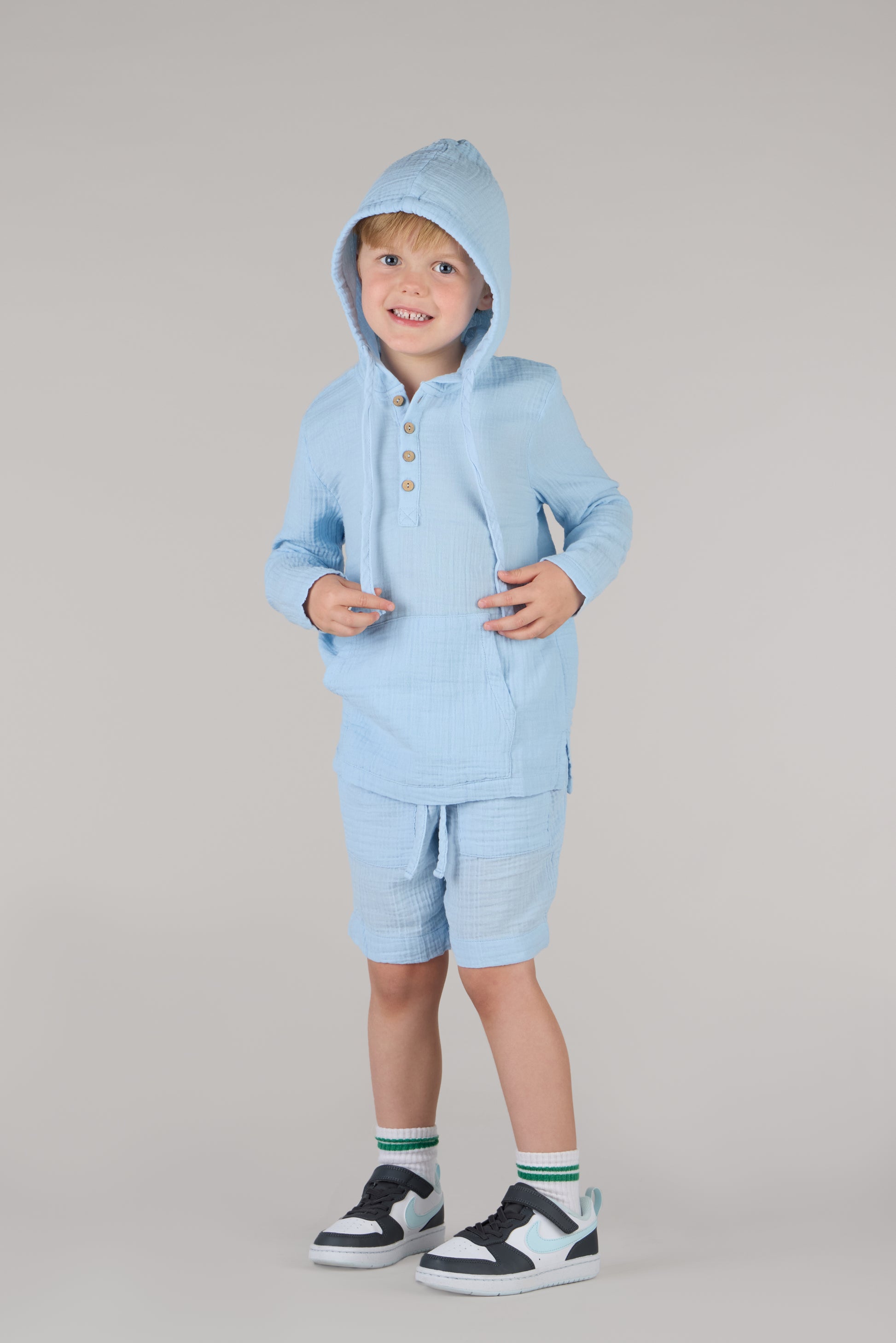 Keep your child cozy and stylish with this versatile ice blue hoodie shirt. Made from 100 % soft cotton, it features a comfortable fit with a lightweight texture, making it perfect for year-round wear. Designed with a hood, buttoned front plucked, and a functional front pocket, this hoodie blends casual charm with practicality. A great choice for layering or standalone wear, it's a wardrobe staple for every young adventurer.
