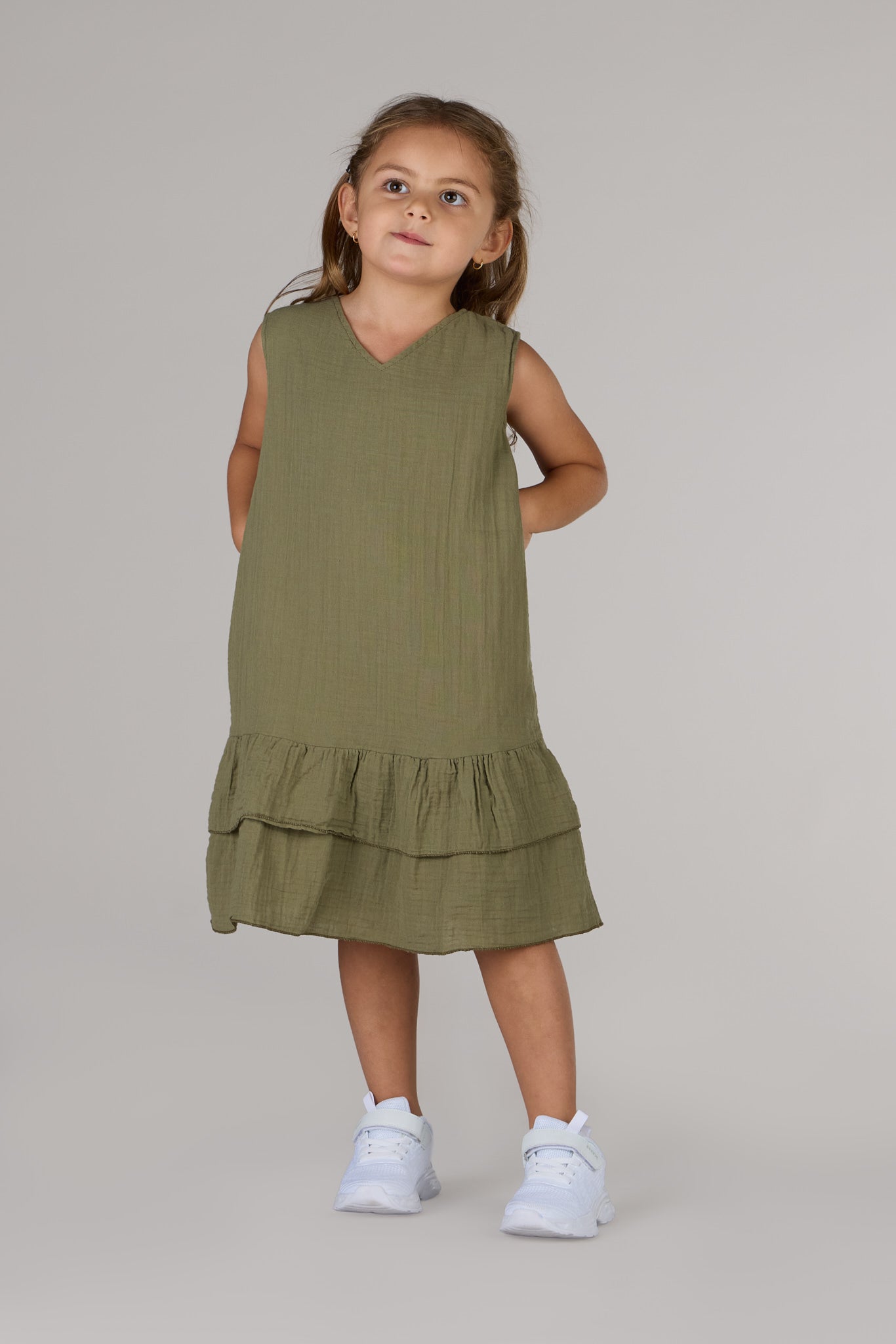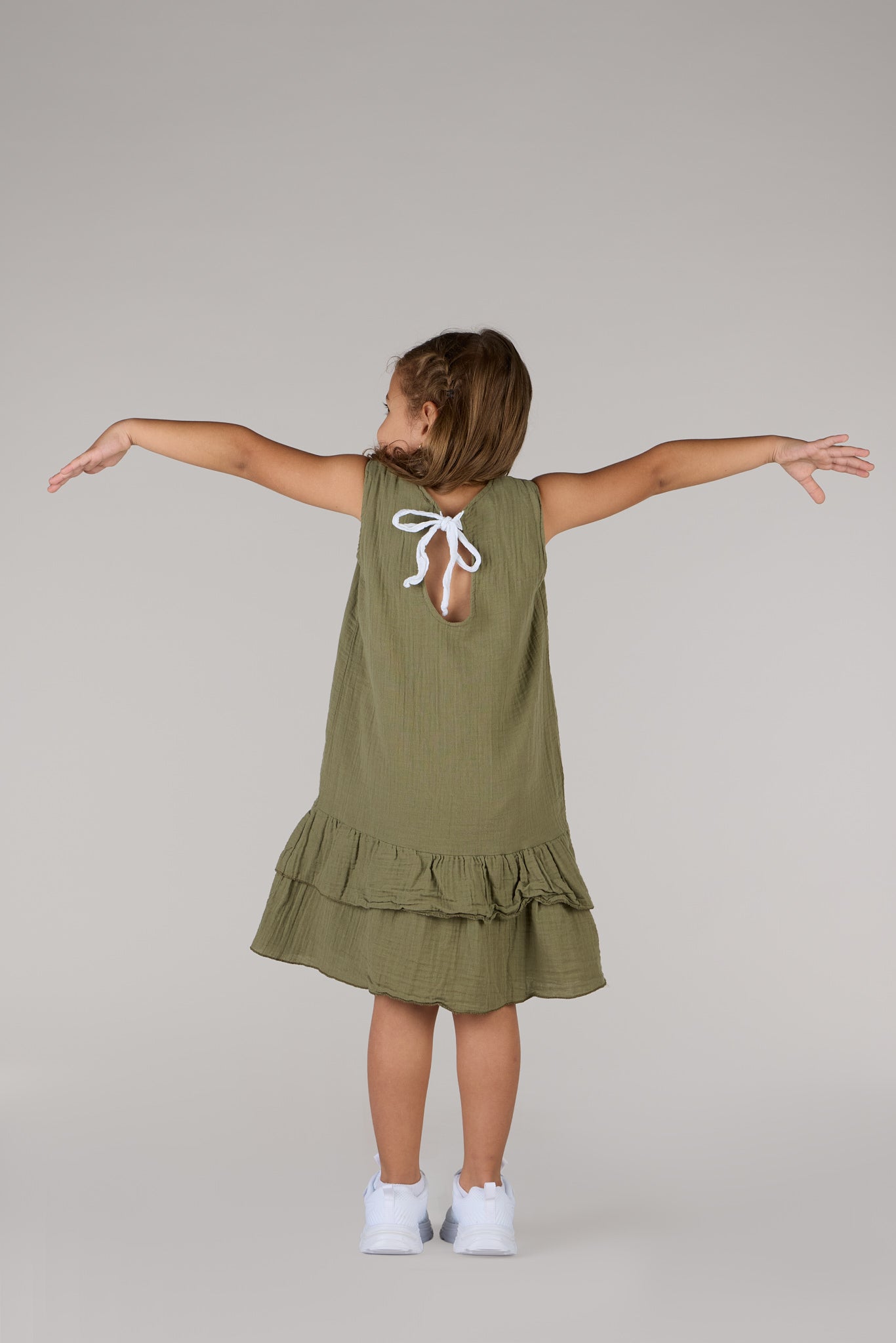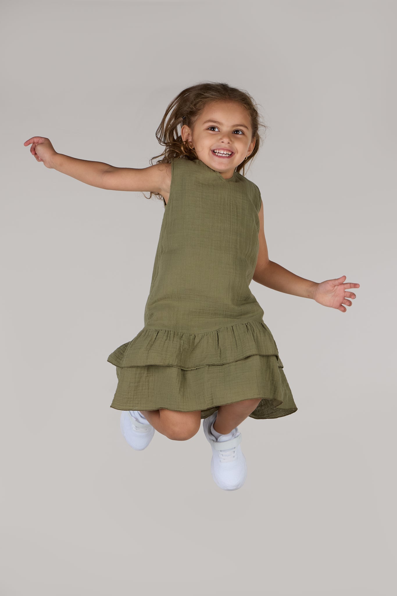 The Kids River Dress in Indigo is a charming and lightweight piece designed for both comfort and style, Crafted from 100 % soft cotton, this dress features a relaxed fit with a sleeveless design and a subtle V-neckline. The layered ruffle hem adds a playful touch, making it perfect for any occasion, from casual outings to special events. The olive color offers a timeless and versatile appeal that pairs beautifully. Thoughtfully made to prioritize sustainability and comfort, this dress is gentle on your child's skin and the environment.