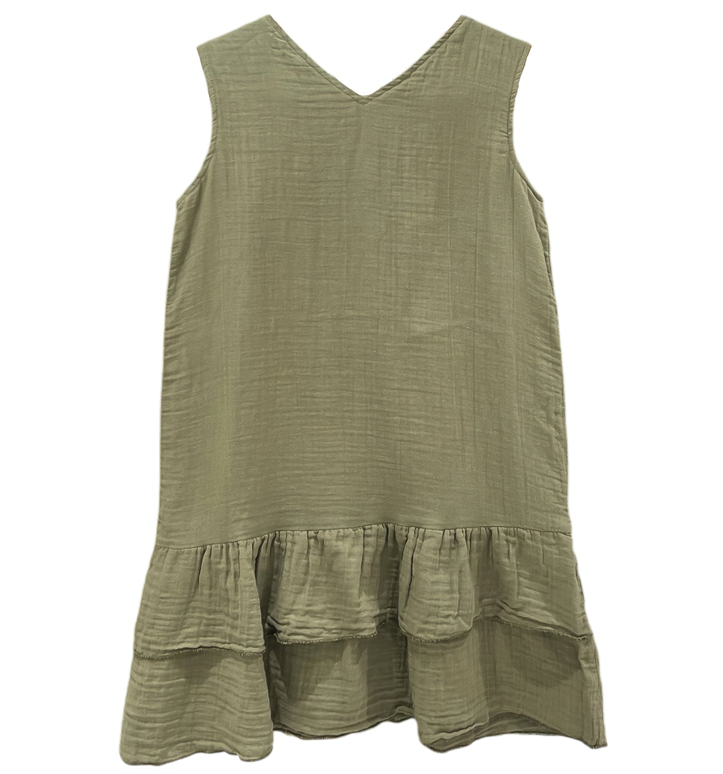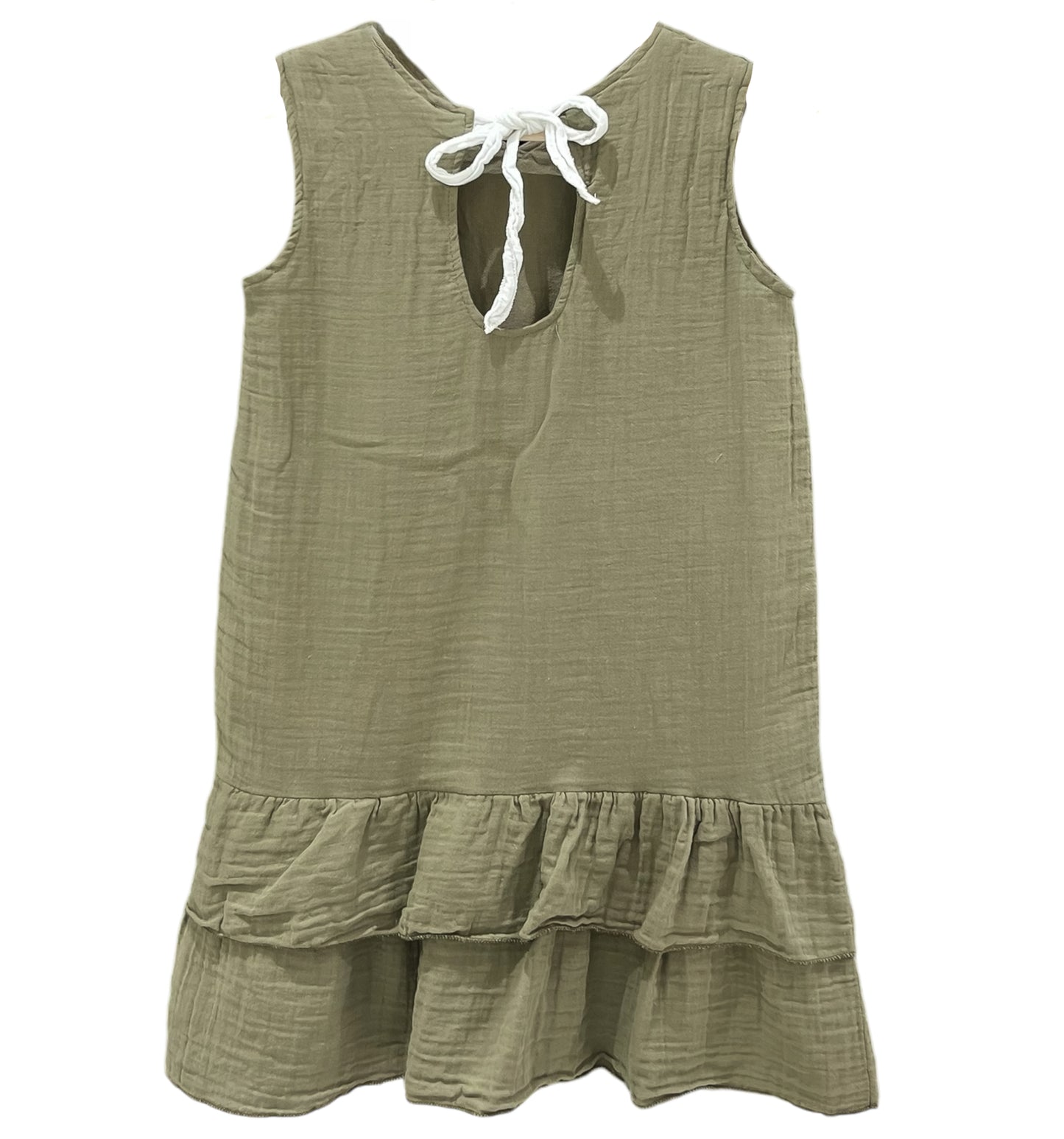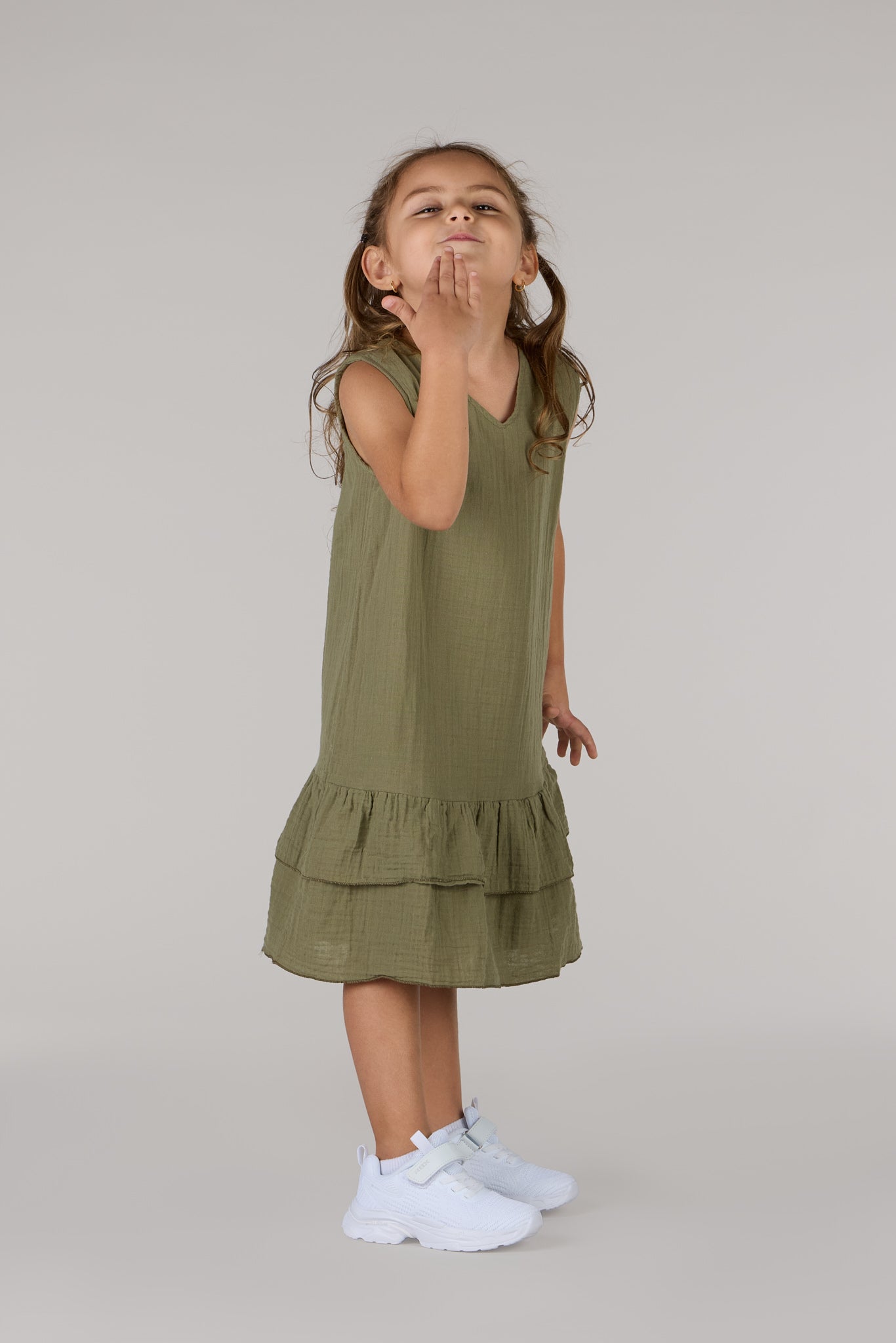 The Kids River Dress in Indigo is a charming and lightweight piece designed for both comfort and style, Crafted from 100 % soft cotton, this dress features a relaxed fit with a sleeveless design and a subtle V-neckline. The layered ruffle hem adds a playful touch, making it perfect for any occasion, from casual outings to special events. The olive color offers a timeless and versatile appeal that pairs beautifully. Thoughtfully made to prioritize sustainability and comfort, this dress is gentle on your child's skin and the environment.