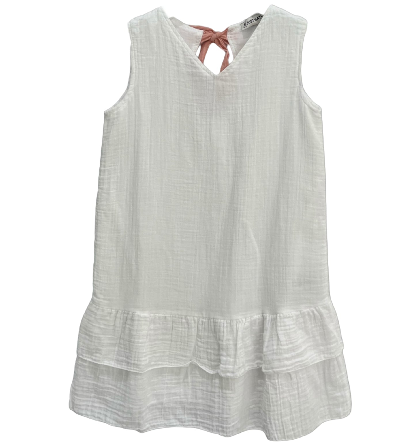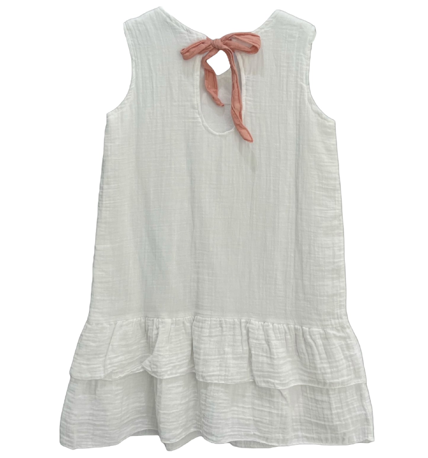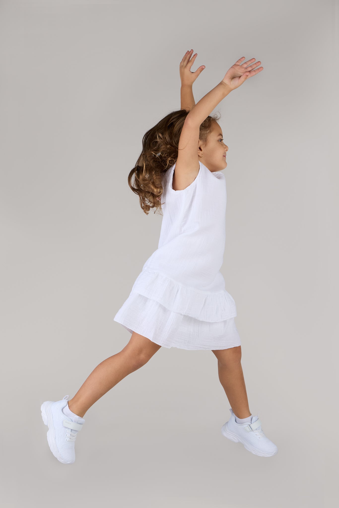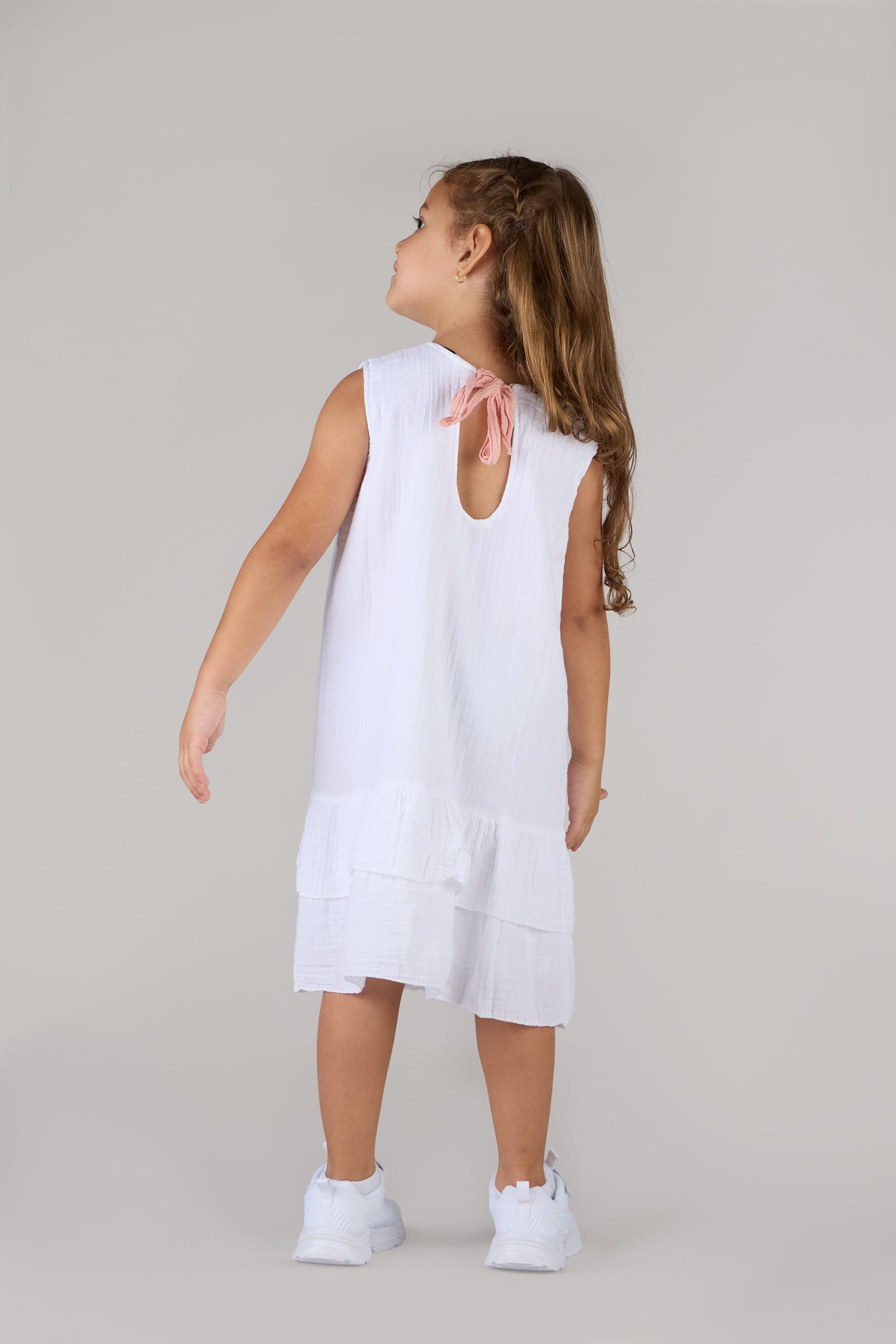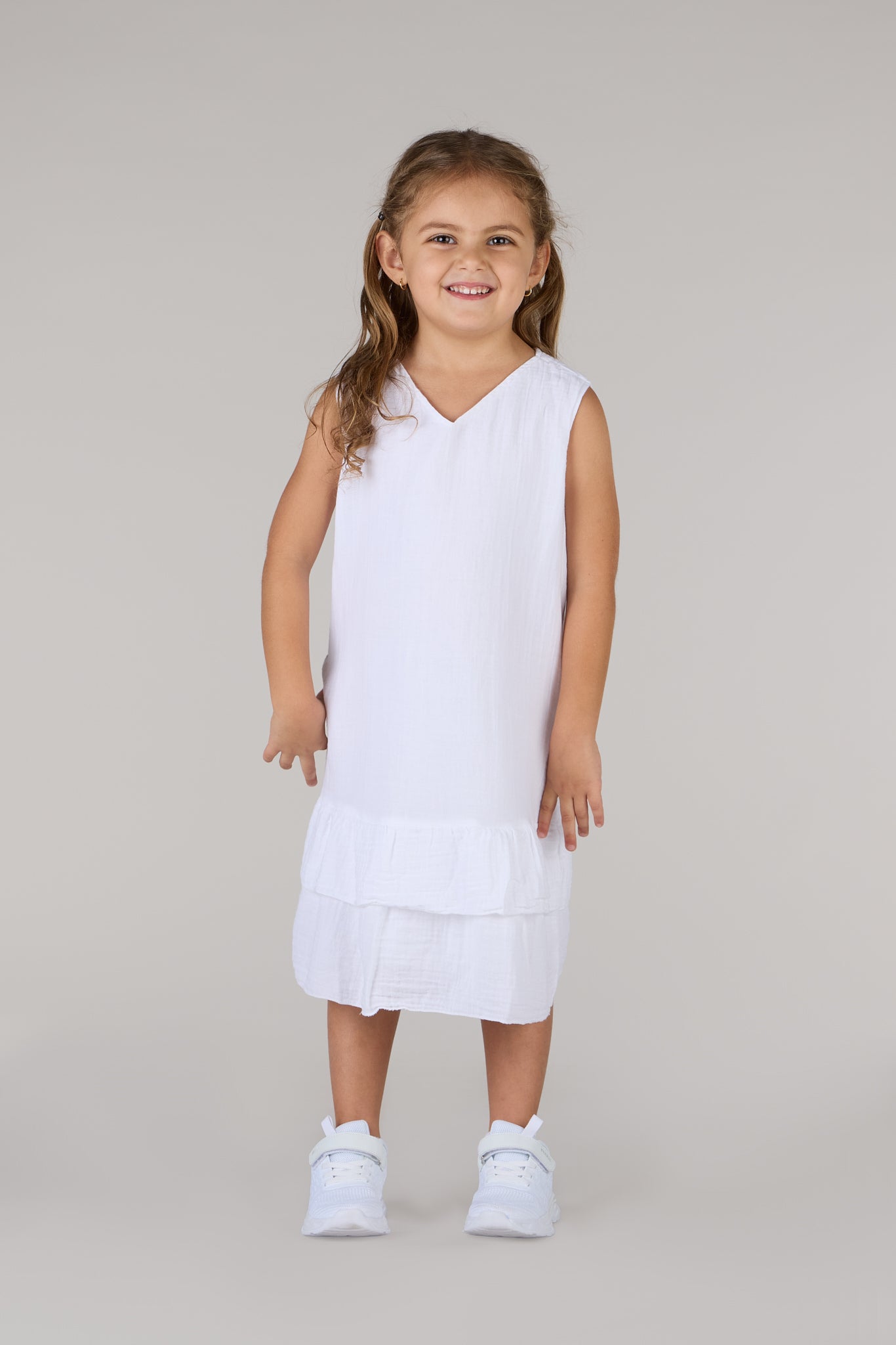 The Kids River Dress in Indigo is a charming and lightweight piece designed for both comfort and style, Crafted from 100 % soft cotton, this dress features a relaxed fit with a sleeveless design and a subtle V-neckline. The layered ruffle hem adds a playful touch, making it perfect for any occasion, from casual outings to special events. The white color offers a timeless and versatile appeal that pairs beautifully. Thoughtfully made to prioritize sustainability and comfort, this dress is gentle on your child's skin and the environment.