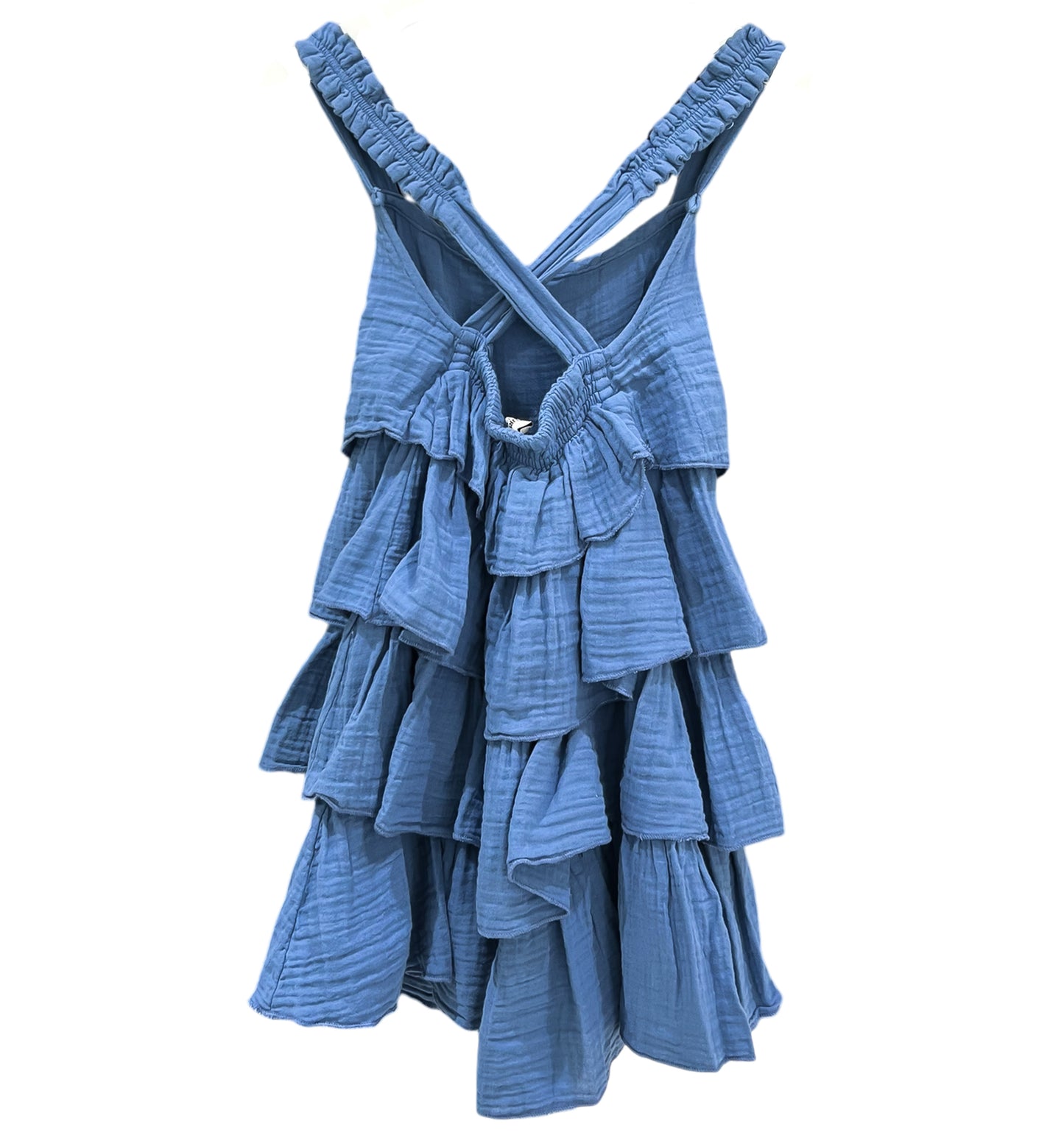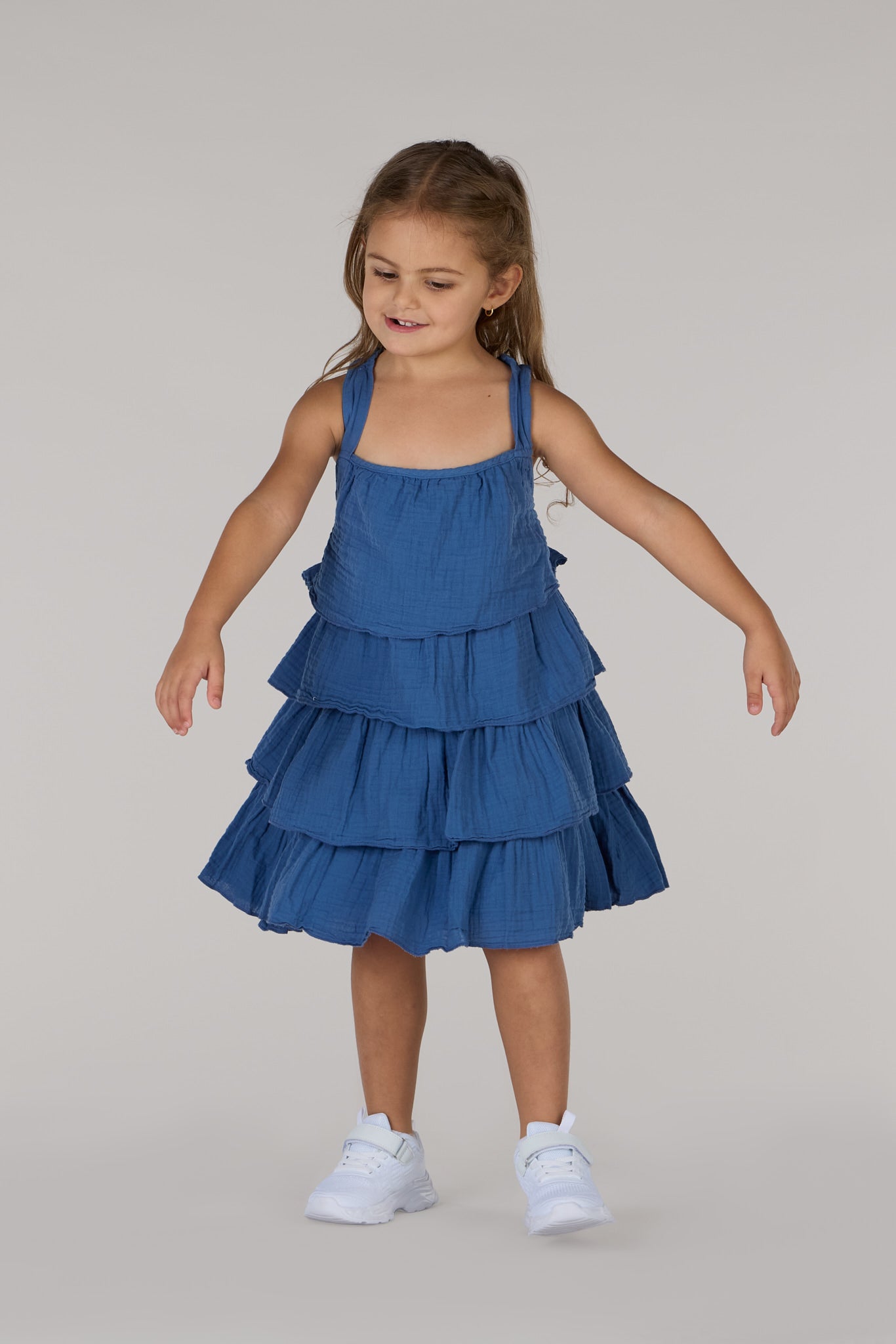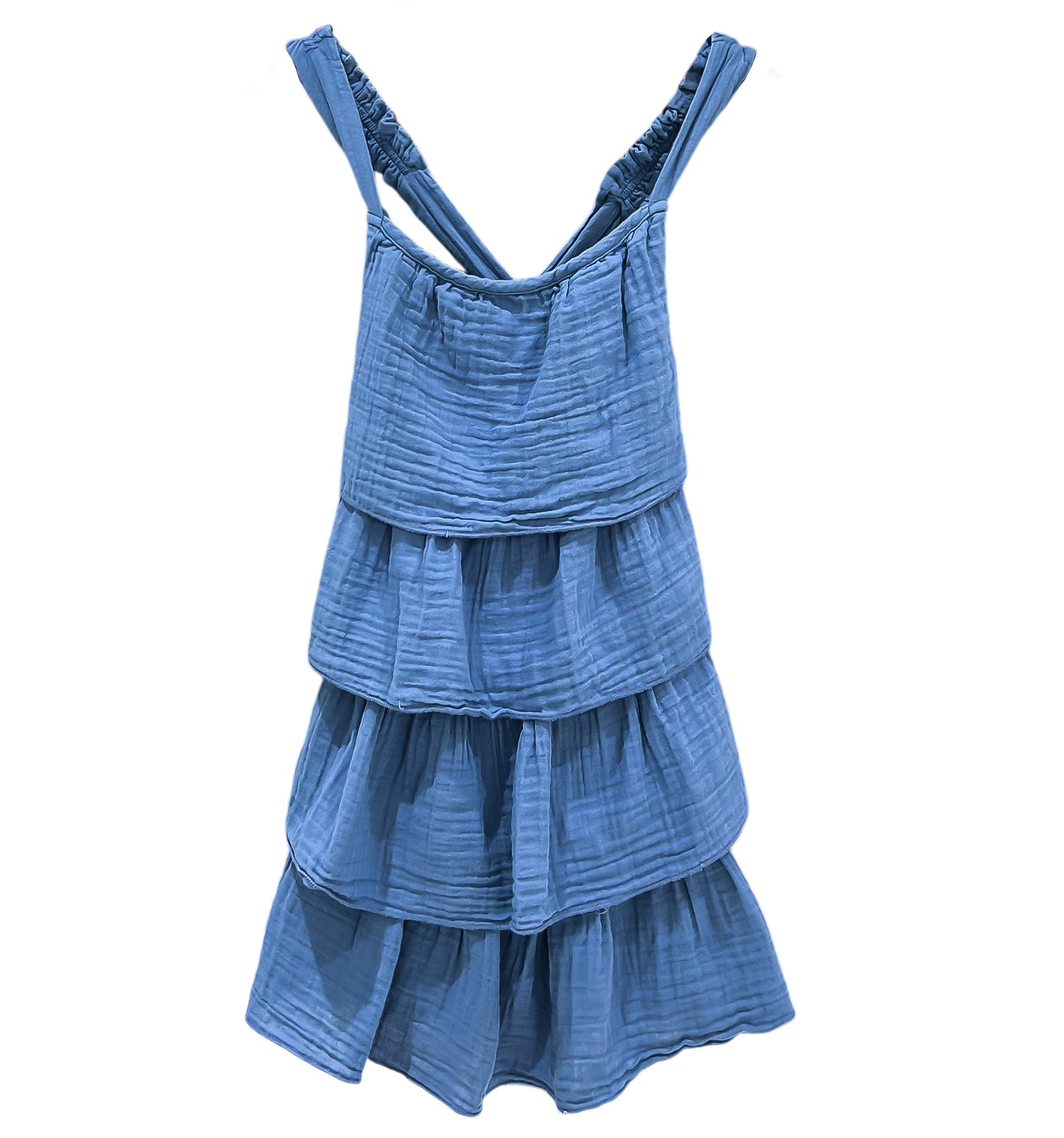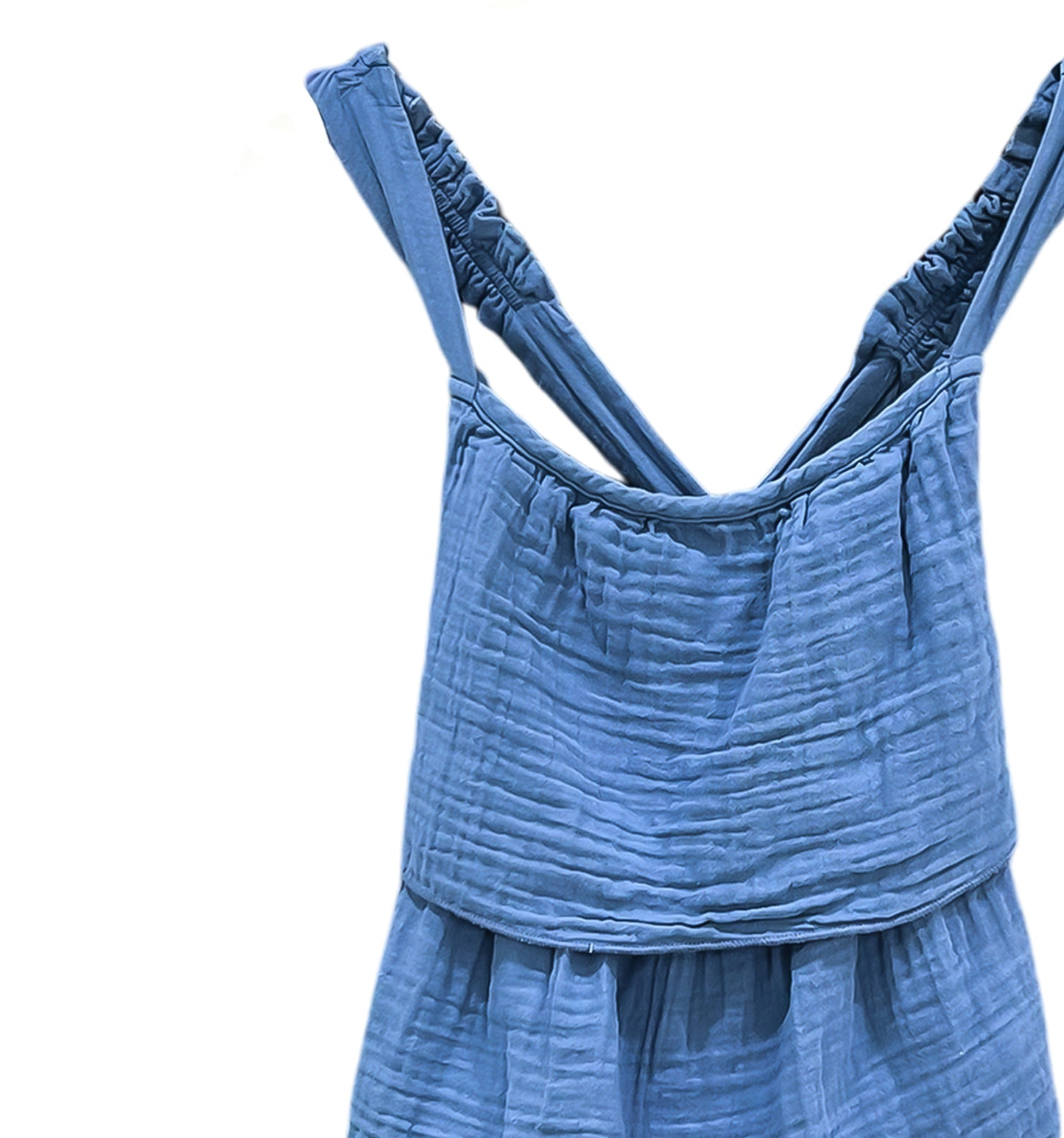Dress your little one in comfort and style with the Kids waves Dress in a beautiful indigo shade. Crafted from 100 % soft cotton, this sleeveless dress is perfect for warm days, offer light and breathable feel. The V-neckline and double-layered ruffled hem add a playful and charming touch, making it ideal for both casual outings and special occasions.